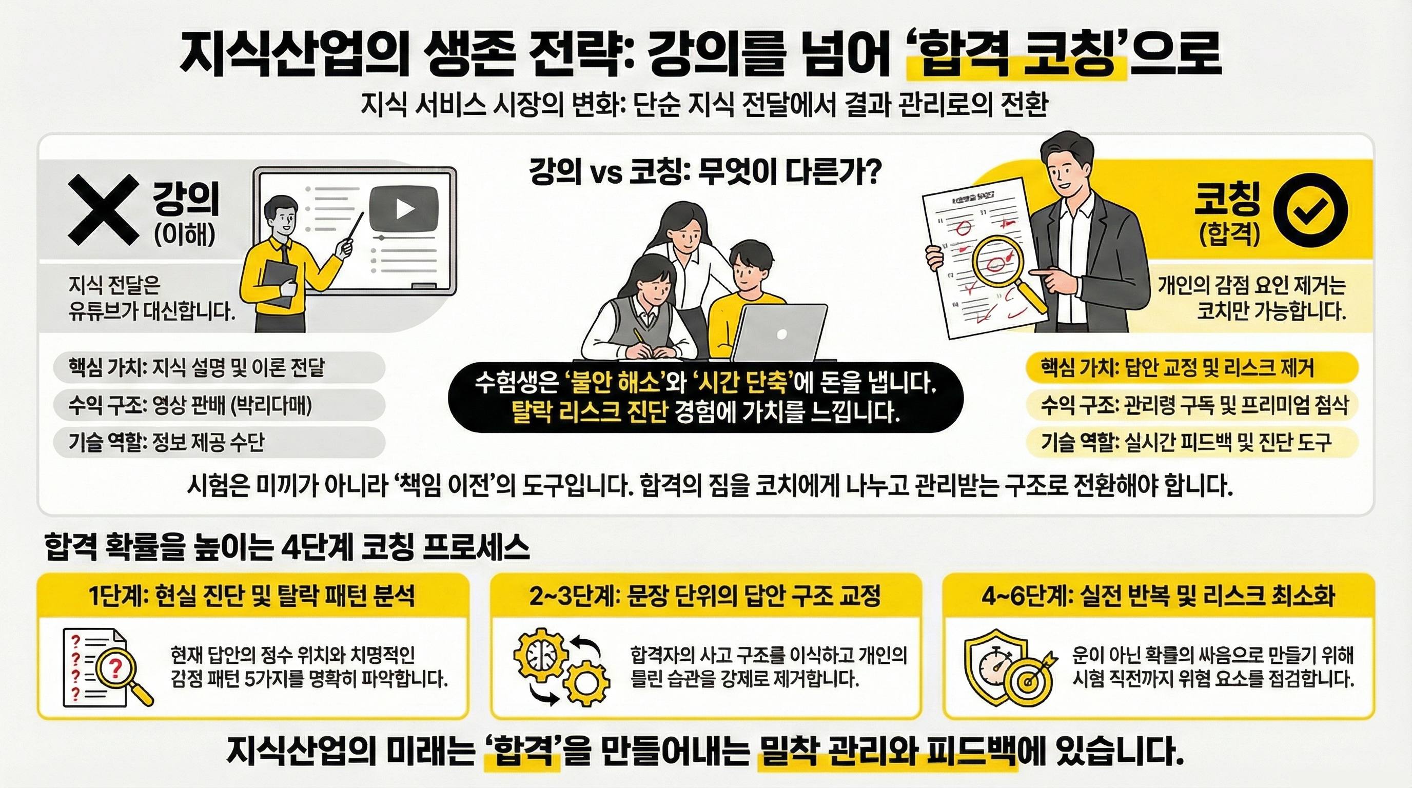 ÀÌ¹Ì ½ÃÀå¿¡´Â Á¾¸ñº°·Î Àü¹®¼ºÀ» °®Ãá °»çµéÀÌ Á¸ÀçÇÑ´Ù. À̵éÀÌ ´Ü¼øÈ÷ Áö½ÄÀ» Àü´ÞÇÏ´Â ¿ªÇÒ¿¡¼ ¹þ¾î³ª, ¼öÇè»ýÀÇ ´ä¾ÈÀ» Á÷Á¢ ¶â¾î°íÄ¡°í ÇհݱîÁöÀÇ ÆäÀ̽º¸¦ Á¶ÀýÇØ ÁÖ´Â ¡®ÄÚĪ ½Ã½ºÅÛ ¿î¿µÀÚ¡¯·Î º¯¸ðÇÑ´Ù¸é, ÀÌ´Â ´Ü¼øÇÑ À§±â ±Øº¹À» ³Ñ¾î Áö½Ä ºñÁî´Ï½ºÀÇ ·¹º§¾÷ÀÌ µÉ °ÍÀÌ´Ù.